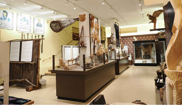 常設展示室は上層・下層の2層構造になっていて、上層階は「アイヌの歴史と文化に出会う」をテーマにアイヌの歴史とアイヌや北方民族の生活資料、さらに文化の伝承と創造に取り組む現代のアイヌの姿を紹介しており、他にも擦文時代の竪穴住居、アイヌの伝統的住居チセ、屯田兵屋などを展示しています。